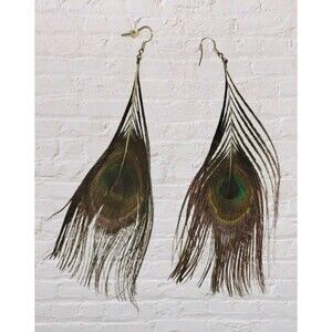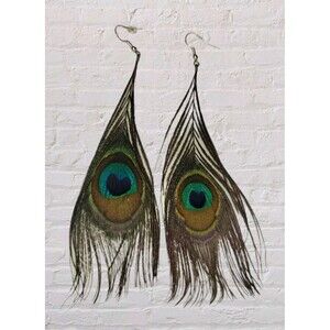 Handmade dangle drop earrings. Made with authentic peacock feathers, featuring an iridescent shine with a vibrant, eye-catching finish.