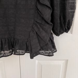 Finders Keepers Sofia mini dress in black with a textured overlay. Faux wrap, secured waist, and ruffle hem create a soft, feminine silhouette. Long balloon sleeves, partially lined body, unlined sleeves, and a keyhole back with concealed zipper. Lightweight and flowy, ideal for date night, or parties