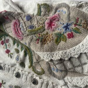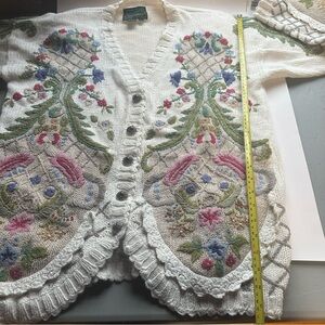 Vtg Hand Knit Embroidered Cardigan Sweater Women’s Large Twee Chunky Floral