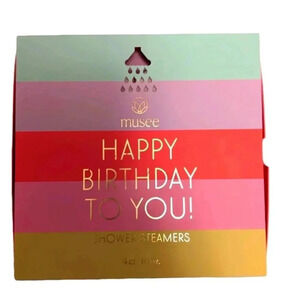 NWT Musee Happy Birthday To You Shower Steamer Showering you with birthday wishes! Treat yourself to a refreshing shower, as vanilla fragrance fills the air and relaxes your senses.