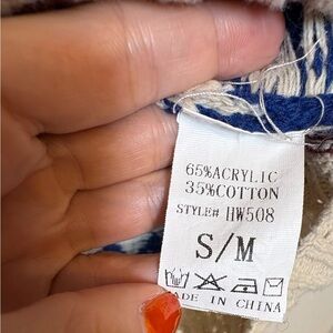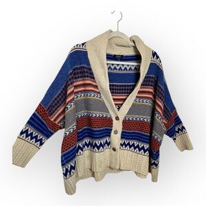 A cozy oversized cardigan in cream and blue with warm cabincore striping and a chunky shawl collar. Relaxed fit with a soft, textured knit that’s perfect for layering.