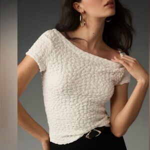 Off white textured stretchy top by Maeve with a chic low back and short sleeves.
