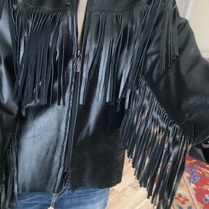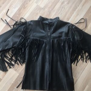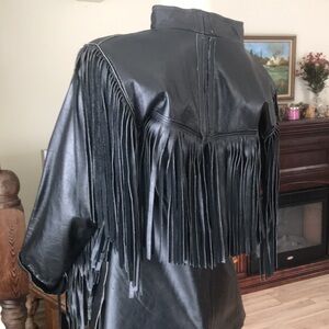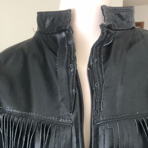 Stylish black leather jacket with fringe detailing, perfect for adding a bold touch to any outfit. Good vintage shape. Please see all photos for condition and measurements.