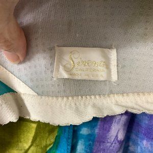 This is a vintage 1950s, 1960s, sleeveless, adjustable button strap, built in shaped cups, green, pink, purple, and blue tropical print, one piece bathing suit from Sirena California. Made in USA. Back zipper. Lined. Discoloration on inside of cups. Elastic on lining leg openings has no stretch. No materials tags. Feels like cotton. No size tags. Size based on measurements. pinup, retro, pin-up, pin up, play suit, swim suit, pool, beach, vacation, resort.