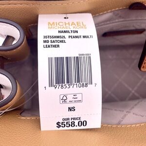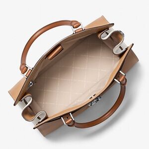Chic Michael Kors satchel with dual handles. Features a stylish lock detail and adjustable strap. Perfect for versatile wear.