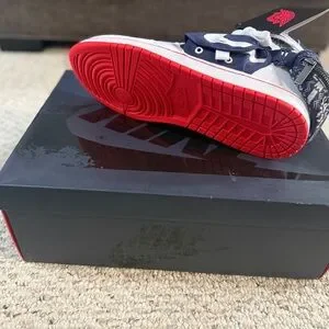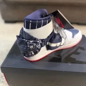 Stylish Jordan sneakers in navy and white. Features a striking red sole. Ideal for casual wear.