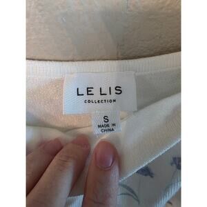 LE LIS Women's Knit Floral Spaghetti Strap Midi Dress. Size Small. White with Purple Flowers. Soft Knit Fabric. 50% Rayon. 28% Polyester. 22% Nylon. Adjustable Straps. In Excellent Preowned Condition. Smoke Free Home.