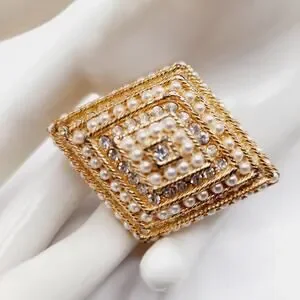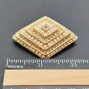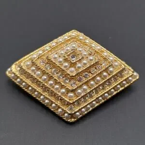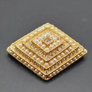 Add timeless elegance to your collection with this vintage rhinestone and faux pearl brooch in a bold diamond-shaped design. Measuring approximately 2 1/4 inches wide, this gold-tone brooch features intricate layers of shimmering rhinestones and luminous faux pearls arranged in a tiered, dimensional pattern for a stunning statement piece.