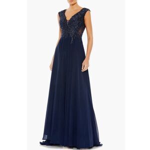 MAC DUGGAL 20264 APPLIQUED CAP SLEEVE EMBELLISHED BODICE NAVY FLOWY $ 598 NWT