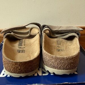 Birkenstock Oita Suede leather taupe sandals. Adjustable velcro straps. Unisex EU 40 Ladies 9 Men’s 7 Narrow fit. One shoe is darker than the other as shown. Please see all photos. Sold as is. No returns! Any Questions? Leave a comment below!
