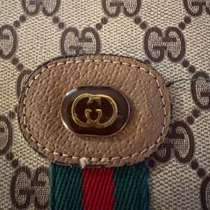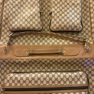 Elegant Gucci travel bag with signature monogram pattern. Features classic beige and brown tones,
