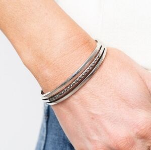 Elegant silver triple band bracelet with sparkling accents. Perfect for any occasion.