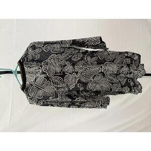 Black and white women's tunic with intricate abstract patterns.