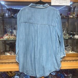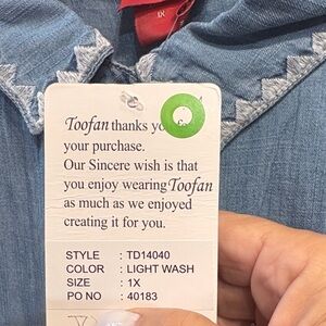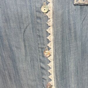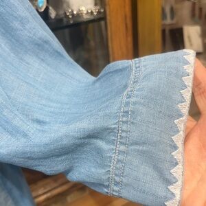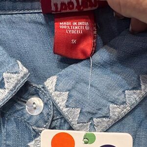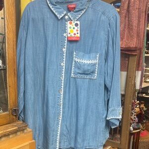 Stylish blue denim tunic top with white cotton embroidery made of 100% Tencel in brand new with tags condition and a size 1X . Perfect for all seasons you can wear it as a jacket or under a sweater or alone very versatile.