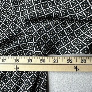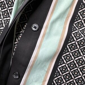 Elevate your wardrobe with this striking Dana Buchman blouse, a masterful blend of classic and contemporary design. The captivating geometric print in black white and subtle gold creates a visually dynamic pattern that is sure to turn heads. A central panel featuring elegant mint green and beige stripes adds a sophisticated touch, drawing the eye and enhancing the overall aesthetic. The classic button-front closure and refined collar create a polished silhouette, while the button cuffs on the long sleeves offer a touch of tailored detail. This versatile top is perfect for dressing up for a business casual meeting or pairing with jeans for a chic weekend ensemble.
