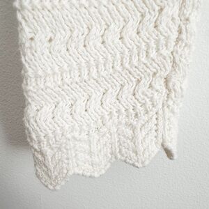 Elegant off white cotton crochet knit sweater cardigan. Features a crew neck, long sleeves and scalloped edges. Adds sophistication to any look!
