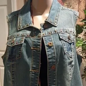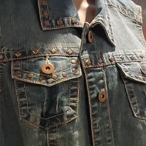 Chic sleeveless denim vest. Features stylish buttons and front pockets. Ideal for layering.