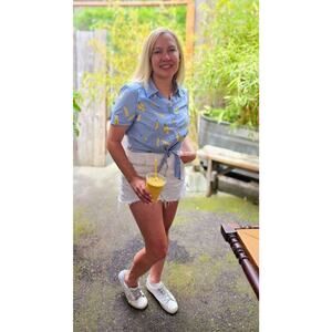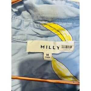 Make a playful and polished statement in this MILLY Bonnie crop top, crafted from crisp 100% cotton and adorned with a cheerful blue-and-yellow banana print that adds a touch of whimsy. The flattering V-neckline and adjustable tie-front detail create a chic, customizable fit while enhancing the midriff with a subtle peek-bow accent. Tailored in size Medium, the lightly structured crop silhouette pairs beautifully with high-waist jeans, skirts, or tailored trousers. Lightweight and breathable, it’s ideal for warm-weather wear—think weekend brunches, picnics, or garden parties.