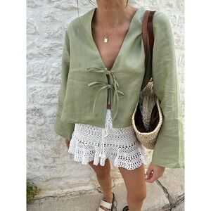 Commense Oversized Long Tie-Front Sleeve Blouse Green size S