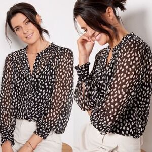 Capture attention with this captivating black and white dalmatian print blouse. The sheer fabric offers an ethereal feel, while the delicate ruffle neckline adds a touch of feminine charm. Billowing long sleeves with elegant cuffs create a sophisticated silhouette. Perfect for a chic brunch date or an evening out with friends.