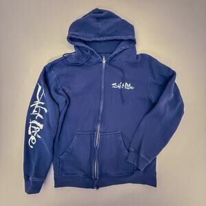 Salt Life full zip hoodie in a dark navy color with classic “Live Salty” branding. Features a small Salt Life logo on the front chest, large graphic logo on the back, and bold Salt Life print down the sleeve. Full-zip closure with drawstring hood and front kangaroo pockets. Great everyday casual layer for beach, surf, fishing, outdoors, and streetwear looks. Please review all photos for details.