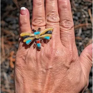 Elevate your jewelry collection with this exquisite Zuni Multi-Stone Inlay Dragonfly Ring, a testament to the masterful craftsmanship of artist Tamara Pinto. Handcrafted in the heart of the Zuni Pueblo, this ring is more than just an accessory—it is a piece of cultural heritage.