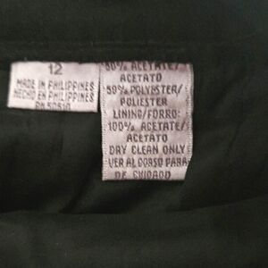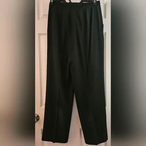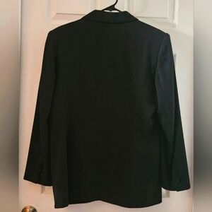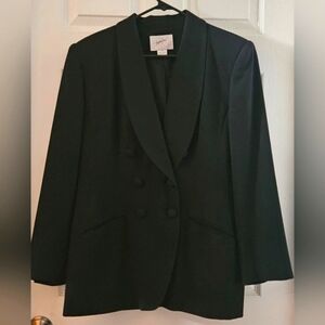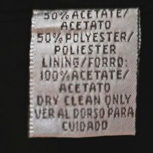 Like new, black 2 piece blazer/jacket and slacks pantsuit. Blazer is lined with padded shoulders, folded collar that goes into a partial button down front. Two open front pockets and button embellishments at the cuffs. The slacks are also lined and have a 1" wide waistband with a 6" zipper and button front closure. Pleated front with two open side pockets. Made from 50% acetate and 50% polyester fabric. Lining is 100% acetate. Excellent condition🌻