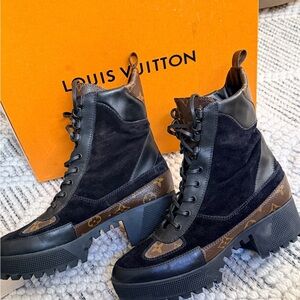 Louis Vuitton Black and Brown Monogram Lace-Up Boots