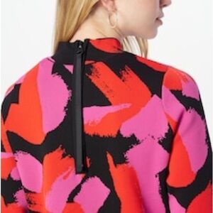Stylish sweater with bold red and pink abstract patterns. 1/4 Back zipper with pull.