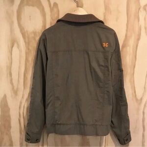 Rugged olive jacket with zip closure. Features chest pockets and a stand-up collar. Ideal for outdoor adventures.