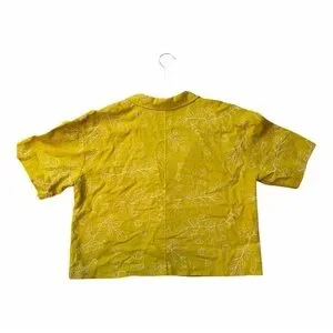 Chic yellow button down with floral design. Short sleeves and classic collar. Ideal for casual outings.