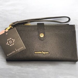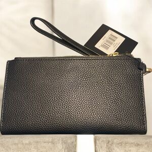 Elegant black wristlet with textured finish. Features gold-tone accents and secure strap. Ideal for stylish outings.