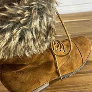 Faux fur trim. Faux suede brown / tan upper. Gold tone hardware.