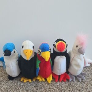Set of five TY Beanie Babies bird plush in vibrant colors. Perfect for collectors or as playful decor.