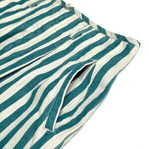 Vintage 1980s Esprit Sport green & off-white vertical stripe cotton denim pencil skirt with zipper & button closure, pockets, belt loops, and a slit/vent at the back.