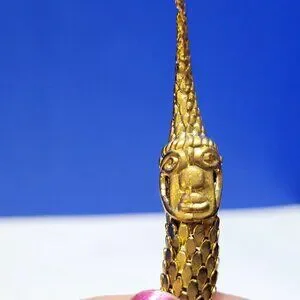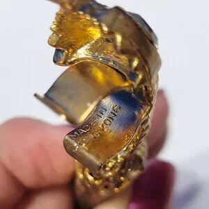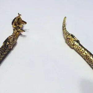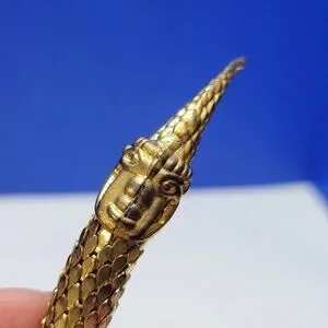 An impressive necklace and bracelet set made of a gold colored mesh. The end is marked hong kong. Each snake has sparkly rhinestone eyes and ornate tail details. Both have some light tarnish that should easily polish if you desire a shiny look. They look great on and make amazing conversation pieces!