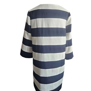 With a fully functioning front placket, this dress can be unbuttoned and worn as a coat or buttoned up ans worn as a dress. Designed with a pieced navy and white stripe, the incredible construction and details make it one of my favorites!