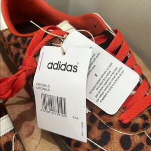 Adidas Samba OG sneakers with a striking animal print. Features red laces and white stripes. The tag says US 7 which is a women’s US 8. I’m a 8 and they are big on me. I say they would best fit a women’s US 8 1/2. Hubby knew I wanted, so he purchased for me while on a business trip. Can’t rerun. So I found a smaller size. They are absolutely adorable.