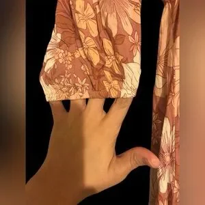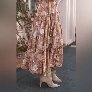 Chic terracotta maxi with floral design. Features a flowing silhouette.