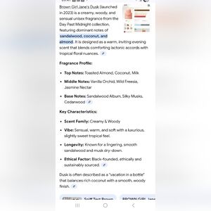 gorgeous coconutty gourmand but clean and fresh a lovely perfume just not for me. I've been on a Holy Grail mission to find an almond and I was hoping this was it my loss is your gain! make me an offer the bottle is probably 3/4 if not Fuller than that