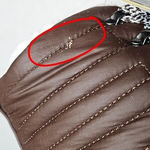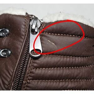 The boots have some minor scratches by the top that have removed the brown color. They are not ripped just slightly scratched. See photos with red circles for clarification.