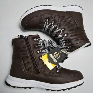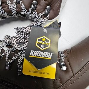 Khombu winter snow boots in a rich brown color. These boots feature a stylish lace-up front, a convenient side zipper, and a cozy white faux fur lining for warmth. The quilted exterior adds a touch of texture, and the waterproof technology ensures your feet stay dry in wet conditions. The durable white sole provides good traction. Includes original tags and Khombu K-Comfort insoles for added comfort.