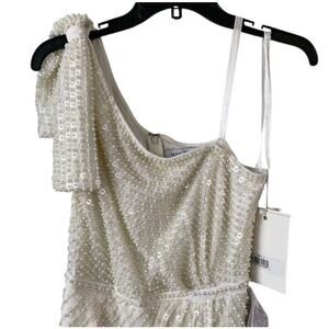 Sculpted one-shoulder evening gown in an ivory, pearl-toned palette with allover beaded embellishment and a dramatic thigh-high slit. The silhouette is sleek and elongating, fitted through the bodice with a straight column skirt that moves cleanly on the body. Modern glam with just enough bridal-adjacent elegance to work for formal events, galas, receptions, or non-traditional wedding looks. High-impact without being overdone. Brand new with original tags.