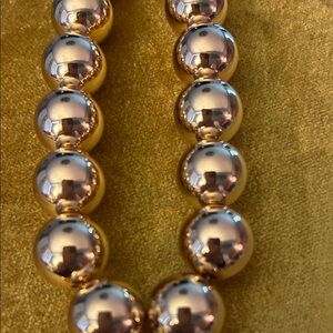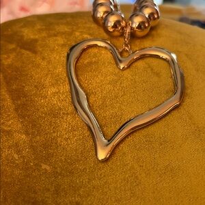 Elegant gold heart pendant necklace made of large gold beads perfect for any occasion. Features a unique heart design with a polished finish.The chain of gold beads is 14 inches with a 3 inch extension. The heart is 3 inches by 2.5 inches and is solid so it can be worn on either side. Strikingly unusual piece.
