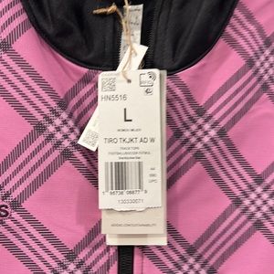 Stylish Adidas jacket with a pink plaid pattern. Features a full zip and side pockets. Perfect for casual wear.
