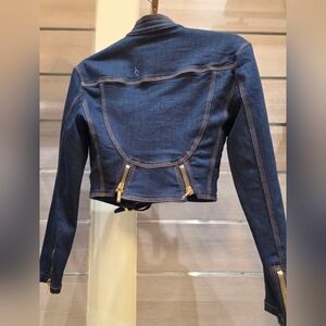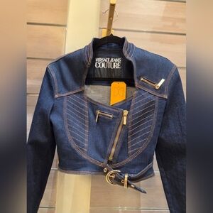 Stylish Versace Jeans Couture blue denim jean jacket with gold accents. Perfect for casual outings. style with high-waisted waisted trousers or a midi skirt for a chic, structured silhouette.