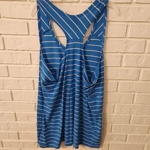 Stylish blue tank top with white stripes. Features a racerback design. Perfect for casual wear.