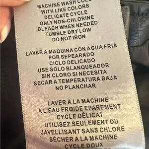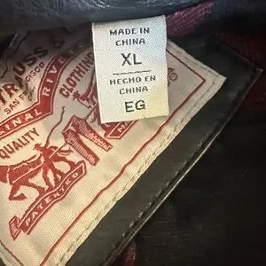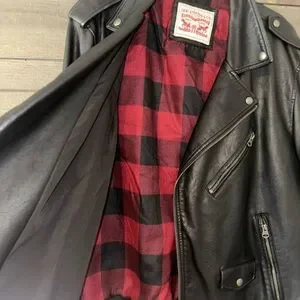 LEVI STRAUSS & CO Sleek black faux leather biker jacket with zip pockets. Classic moto style. Ideal for a modern look. Great jacket. Features zip front with zipped pockets. Lined with black and red checked lining. Size XL. Measures 24 inches from armpit to armpit. Very good condition.