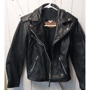 The product is a Harley Davidson women's leather jacket in size small, featuring a classic black color with a zip-up design.