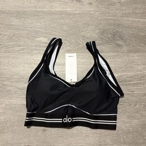 Stylish Alo sports bra and leggings set in black with white accents. Perfect for workouts.